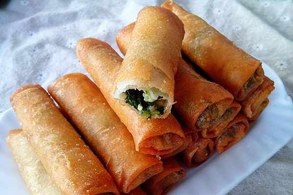 2.在春卷皮里裹上适量的羊肉包馅,卷起;在平底锅中炸至金黄色。