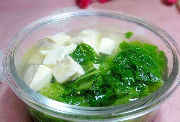4.交替加入切碎的青菜和切碎的豆腐,煮一分钟。待水再次沸腾时,最后把味精倒出锅。