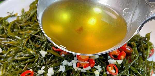 第五步:然后将切碎的大蒜和小米放入羊栖菜中,最后倒入一勺沸腾的热油,拌匀即可食用。