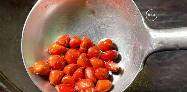 第三步:锅内水全部烧开,加入适量油,将花生米放入锅中炸2-3分钟,至花生米爆裂,颜色变成淡黄色,捞出。花生出来了。