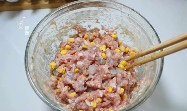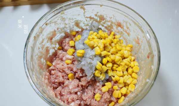 5.虾仁切成小丁,鲜玉米用开水煮熟,加入肉馅,再次拌匀,馅就做好了。如果你愿意,你可以在这个馅里加入煮过的油,让它更香。
