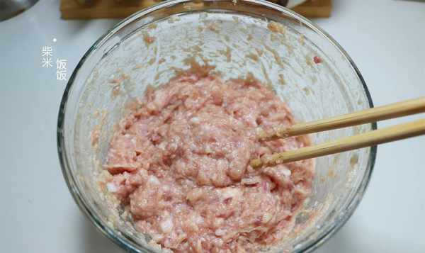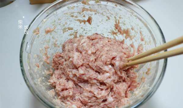 4.分次在肉馅中分多次加入冷水,顺着一个方向搅拌均匀,直至肉馅变得粘稠丝滑。只要在厚脸皮里加2-3两花椒水,去腥增香,肉质更嫩。