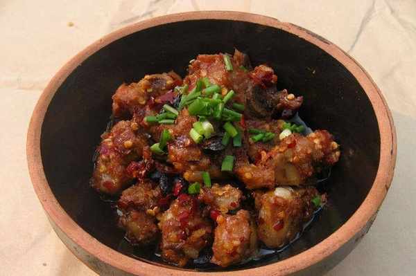 4.锅底留油,烧热,下香灰和干辣椒,用小火炒出香味,然后下葱、姜末、蒜末和鸡肉碎炒一会一会儿,最后加入酱汁,等汤变浓稠时,加入花生仁翻炒几下。