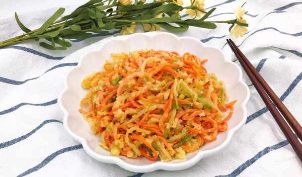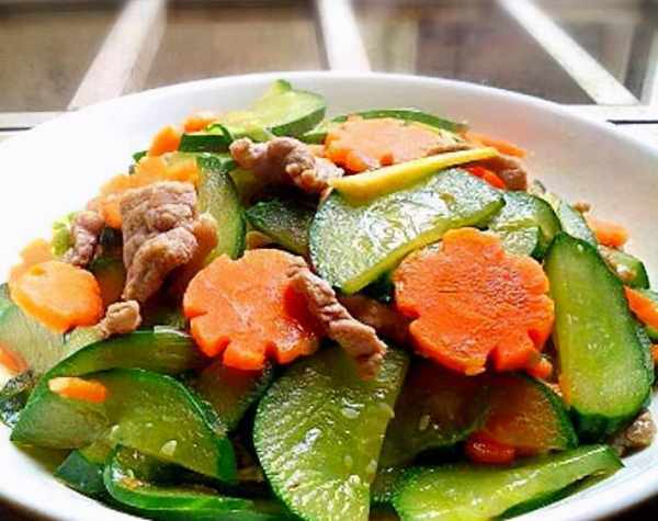 2、将猪肉倒入烧热的油中炸,加入少许料酒,炒出生抽,然后倒入胡萝卜,撒上盐,将胡萝卜炒至一半。煮熟后,倒入黄瓜炒熟,撒少许水拌匀,最后加入葱。