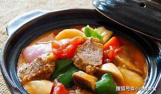 5.加入煮熟的牛肉和1碗牛肉高汤烧开,转小火炖20分钟。最后,加入青椒并用盐和胡椒调味,煮至青椒熟透,然后从锅中取出。