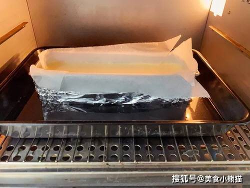 6、放入烤箱以水浴法烘烤,烤温180度20分钟,再以150度烤25分钟,如表面未上色,则先将蛋糕拿出烤箱,上火调至200度下火0度,后放入烤箱至表面上色。