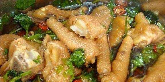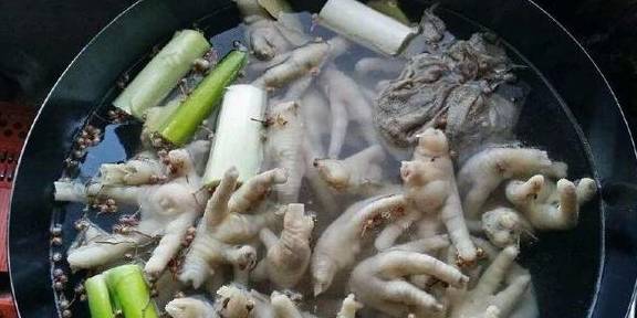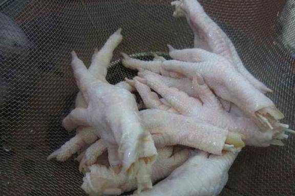 鸡脚洗干净,切成两半,凉水下锅放入料酒、姜片,水开煮开6分钟,关火,水开后放鸡爪,大火烧开,大约五分钟,差不多时间拿一根筷子试着从鸡爪中间肉厚的地方戳下去,很轻易戳穿就可以了。