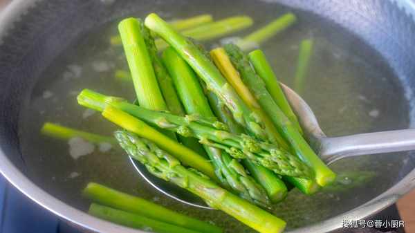 5、起锅烧水,水开加一勺盐和一勺油,然后下芦笋焯水,煮2分钟后就熟了。