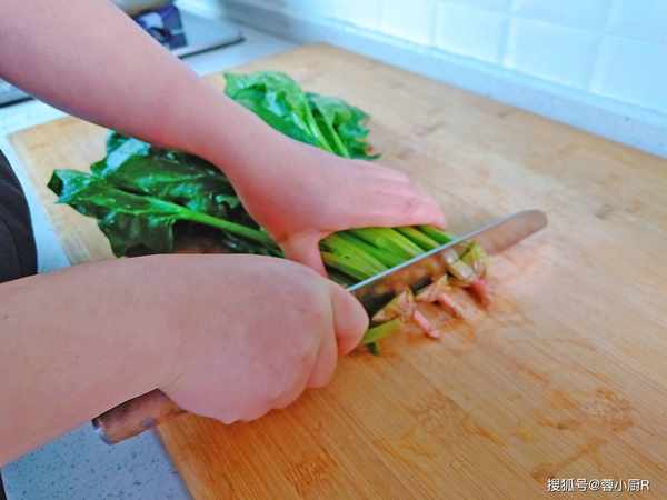 1、新鲜菠菜1把,洗净后只要叶子部分,接着放入锅中焯水。