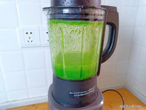 3、接着放入料理机里面,加300克清水打成细腻的菠菜汁。