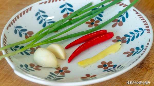 3、接着准备葱姜蒜和小米辣,大蒜2瓣拍碎切末 ,小葱2根卷起来后切丝,生姜一片也切成细丝,小米辣2个对半切开后也切成细丝。