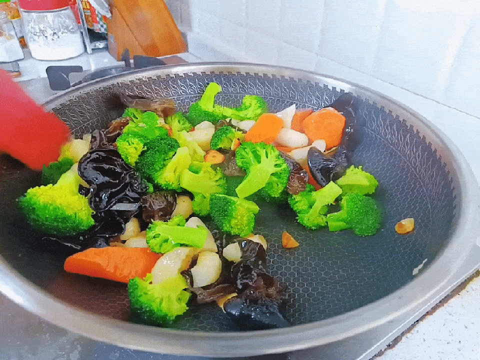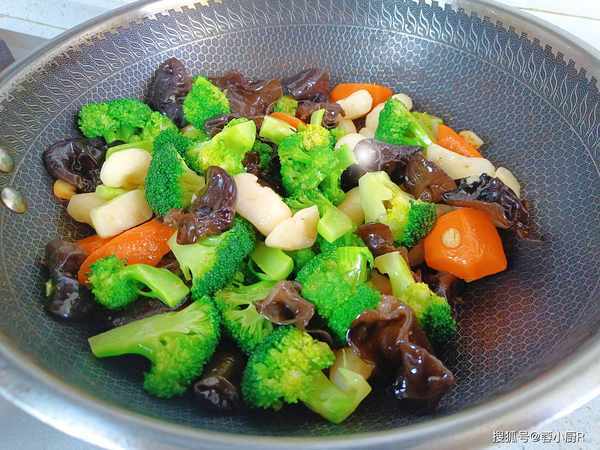 1、起锅热油,下蒜末爆香,接着把焯过水的西兰花、胡萝卜、木耳、荸荠都倒进来。