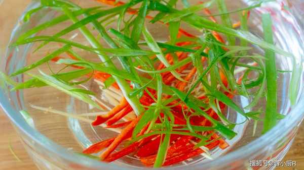 4、全部切好后再把生姜、小米辣、葱花放入水中泡着,葱花水泡后会变成好看的葱花卷哦!