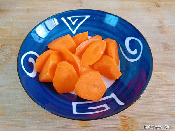 1、胡萝卜一个,清洗干净后先削皮,然后切成滚刀状备用。