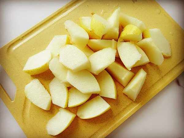 做法:首先把红枣肉剪下来,去核不要。红枣和梨的量自己看着办就行,一般一个雪梨我用八九个大红枣。