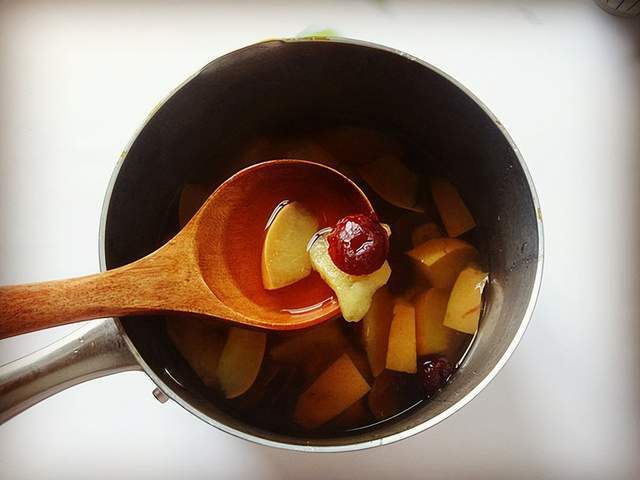 先煮红枣和梨,把红枣肉和梨块一起放入煮锅,加入没过食材的水量,煮开后小火煮15分钟。如果红枣比较干硬,可以提前浸泡一小时。