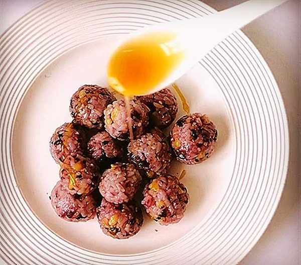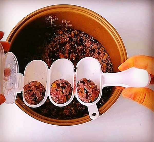 煮好的杂粮饭直接团成小球,可以借助工具来完成,可以戴上手套完成。