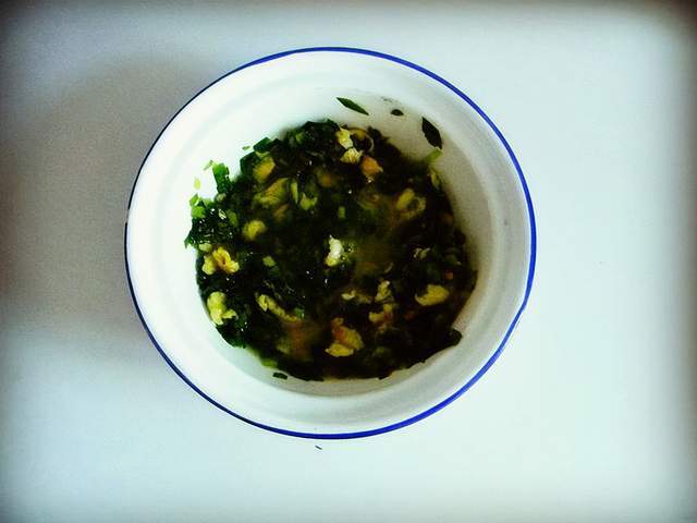做法:韭菜洗干净切碎,鸡蛋炒熟,量根据就餐人数自己掌握就行,放盐、少放一点油,拌匀后再打入一个生鸡蛋拌匀。(如果家里有包饺子剩余的韭菜鸡蛋馅可以直接用)。