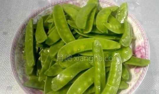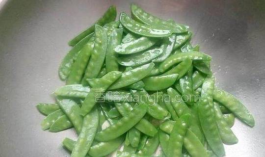 5.将荷兰豆放入滚水中焯1分钟,至颜色变翠绿时捞出。