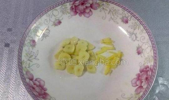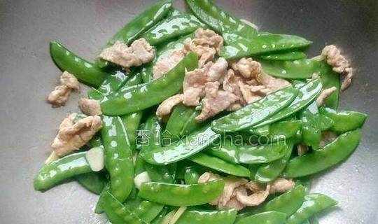 7.锅内继续放点油,加入蒜片、姜丝,爆香后放入荷兰豆爆炒几下。