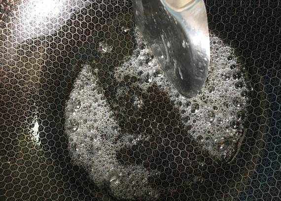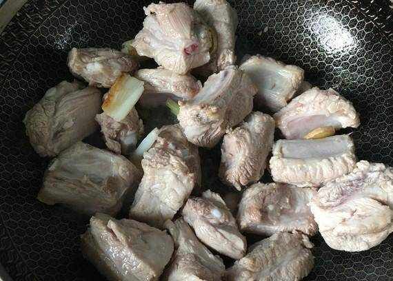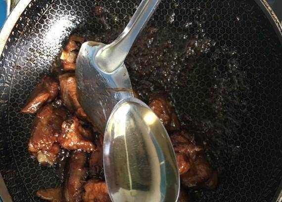 10.糖融化成浅黄色后加入排骨,翻炒,淋上一勺白醋,出锅