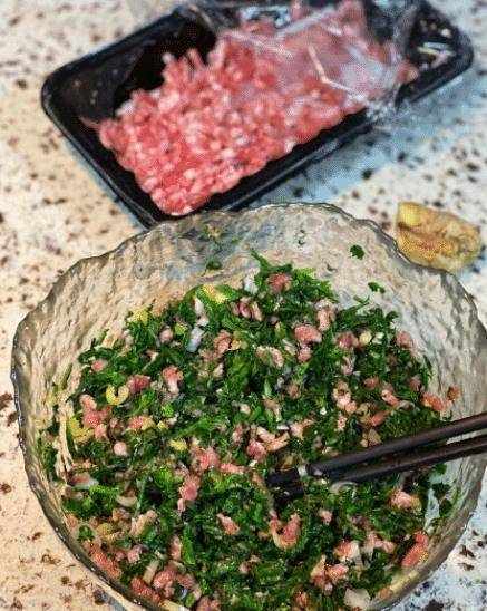 荠菜淘洗干净用水浸泡10分钟,捞出沥水后切末,用盐腌制一会,荠菜处理好了就可以拌饺子馅了,荠菜可以做素馅也可以做肉馅,这要根据大家的喜欢,我喜欢吃肉,准备的是荠菜猪肉馅的,把五花肉洗净剁成肉馅,放入葱末姜末,油,生抽,酱油,蚝油,盐拌匀,10分钟后和荠菜拌在一起,饺子馅就拌好了。