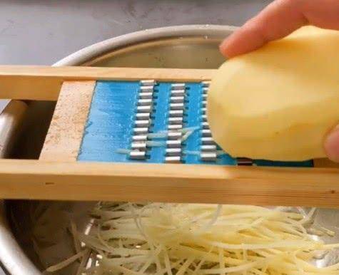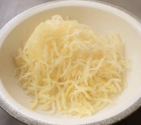 1、首先我们将买回来的土豆削去外面的一层皮,清洗干净后再用擦丝的工具把它擦成丝,刀工好的朋友可以用刀来切。