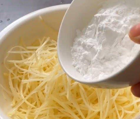 3、接着在土豆丝里面倒入1大碗小麦淀粉,继续加入2小勺食用盐,然后再次用手抓拌均匀。