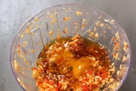 7、准备调料汁:在容器中放入适量的蒜末、小米辣、盐、香油,然后用筷子充分地搅拌均匀。(要是家里有小朋友的话,小米辣可以忽略不放)