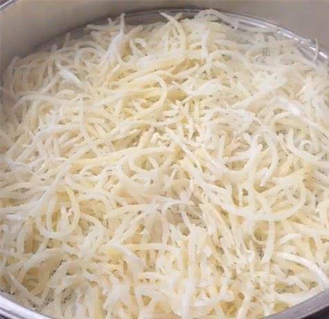 5、等40秒过去之后再打开盖子,用手把土豆丝抓起来迅速抖开抖散,(做这一步的目的是为了防止土豆丝粘连在一块。)然后再盖上盖子继续蒸3到5分钟。