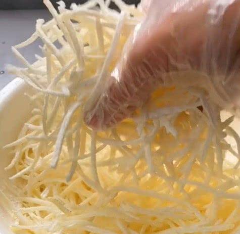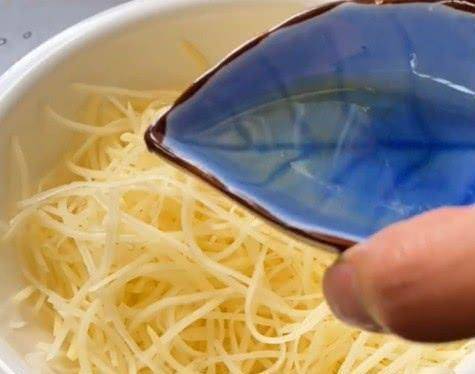 2、把擦好的土豆丝放入清水中淘洗两遍,将土豆淀里面的粉淘洗干净之后再捞出来控干水分装入碗中备用。接着在土豆丝里加入1大勺食用油,然后再用手充分地抓拌均匀。