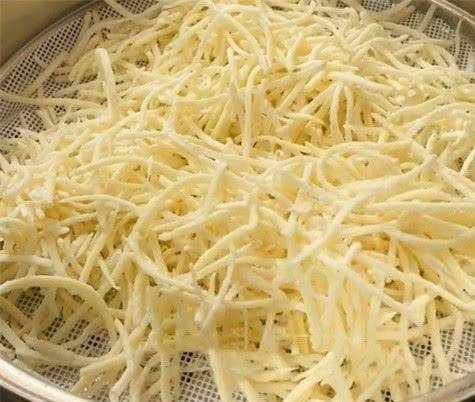 2、蒸土豆丝的时候水开上气后先大火蒸40秒左右再打开盖子,用手把土豆丝抓起来迅速抖开抖散,做这一步的目的是为了防止土豆丝粘连在一块。