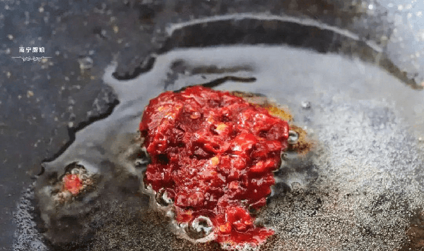 2、起锅烧油,油温升高之后我们先把准备好的豆瓣酱倒进去炒出红油来,炒好之后,再把辣椒面也倒进去一起炒一下;