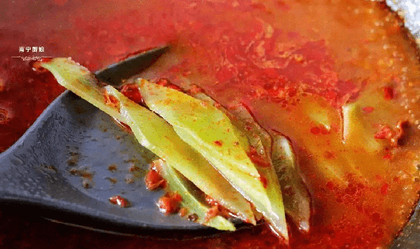 4、水烧开之后,已经和我们的豆瓣酱和辣椒面充分融合,变成了美味的汤汁,这时候我们把切好的莴笋片倒进去烫一下;