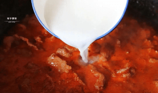 6、牛肉煮熟之后,我们用淀粉调成水淀粉,然后倒入汤里边进行勾芡,勾芡好之后就可以出锅了;