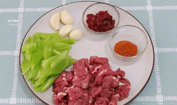准备食材:500克牛肉、300克莴笋、两勺豆瓣酱、4颗大蒜、一勺辣椒面