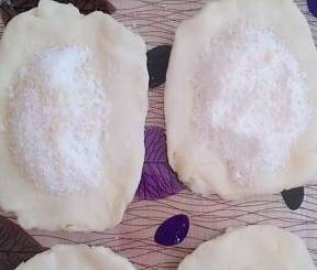 另用一只空碗,放入20g面粉、80g白糖和20g熟芝麻,搅拌均匀,这就是饼馅。用准备好的小剂子,压扁,包上饼馅,再压扁就可以了。