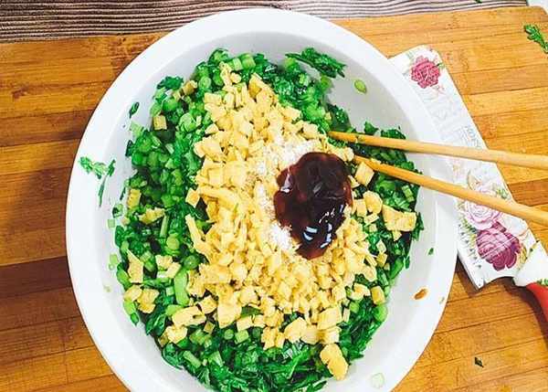 馅料:茼蒿600克,油豆腐100克,盐适量,蚝油适量,鸡精适量,花椒20粒,食用油。