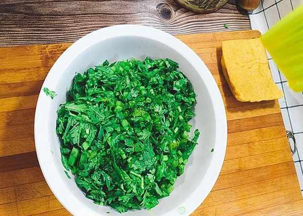 在醒发面团的同时,我们来准备馅料。将茼蒿洗净,切碎,倒入适量的油搅拌均匀,防止茼蒿脱水。放在一边,备用。