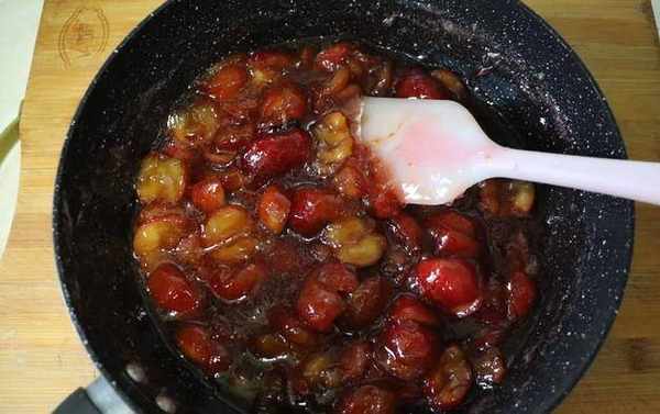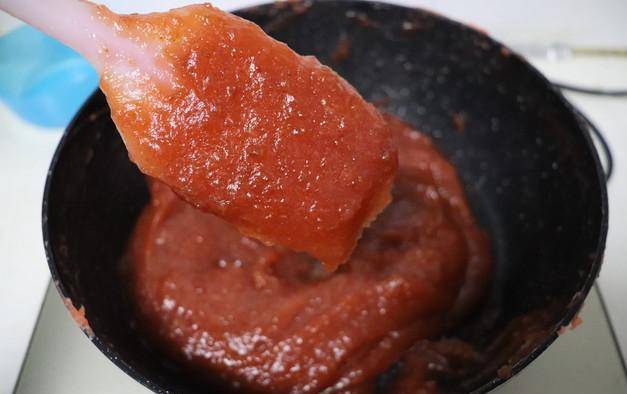 9.倒回到不粘锅中,小火炒5-8分钟,铲子上可以厚厚的挂一层山楂泥