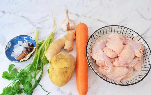 所需材料:鸡中翅12只,土豆1个,胡萝卜半个,大葱10克,姜10克,蒜10克,香菜1颗,小葱1根,八角1个,桂皮1小块,香叶2片,冰糖20克,料酒2勺,生抽2勺,老抽半勺,水500克,食用油适量