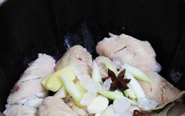2、STAUB铸铁锅倒入适量的食用油烧热,放入鸡翅煎至两面微黄,放入大葱姜蒜、八角、桂皮、香叶、冰糖,翻炒均匀