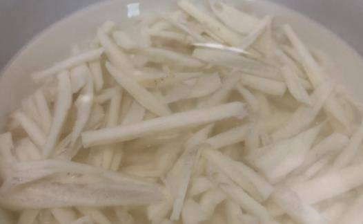 首先,准备莲藕。平时很少有人会制作这道菜,准备莲藕一般都是做成糖拌莲藕的,这里将莲藕给洗干净以后切条备用,放在水中浸泡以后使用,可以多换几次水,就是让莲藕之后吃起来口感更好一些。
