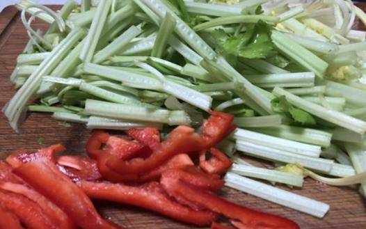 第二,准备芹菜。一般使用清脆的水芹,将芹菜的筋给去除掉,洗干净以后切成长条,然后准备一个红辣椒,洗干净以后切成长条,红辣椒看起来颜色更搭配好看,当然辣椒不需要非常辣。