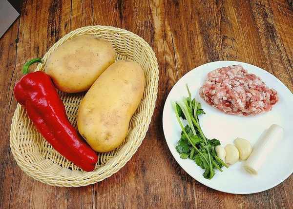 【食材】:土豆2个,猪肉末150克,红彩椒1个,大葱段1根,大蒜3瓣,香菜段2根。