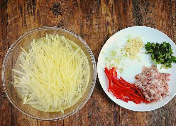 第一步,土豆洗净削去外皮擦成细长的丝,放入水里3到5分钟泡去多余的土豆淀粉,捞出沥干水分加入小半勺盐拌匀备用。猪肉末用水冲洗挤干水分,红彩椒切丝,大葱段,大蒜和香菜段分别切末。