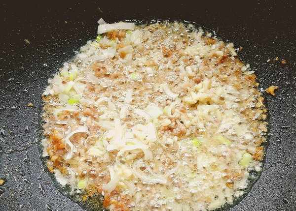 第二步,烧热油锅加入2小勺油,放入猪肉末用小火煸炒出水分,变色后炒出油脂,加入1小勺料酒去腥增香,炒匀后放入大葱末和大蒜末炒出香味。