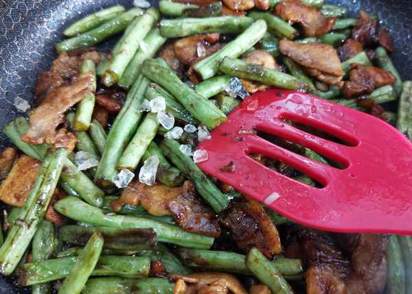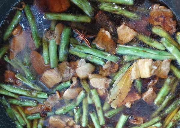 步骤4:葱姜蒜香味出来后,把豆角和五花肉一起翻炒,加入料酒去腥,料酒挥发后,加入生抽、老抽、蚝油、(毕竟您菜、肉、面的多少跟我不见得一样,具体量就凭个人口味好了,我通常大概比例是4:1:1)冰糖、少许花椒粉、八角、桂皮以及香叶。