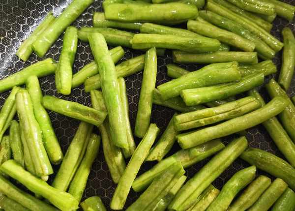 步骤2:五花肉处理好后,盛出来,用五花肉逼出来的油或给锅里倒入比炒菜多些的植物油放入豆角段,豆角段多煸炒一会儿,达到表面抽抽巴巴那种状态口感、味道更好哦~