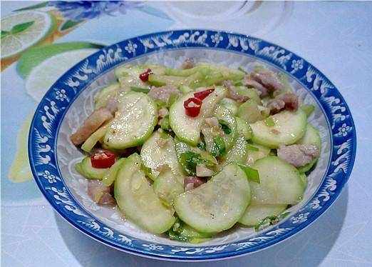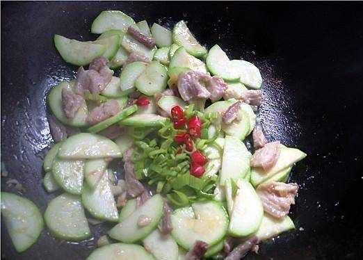西葫芦 1个、五花肉 80克、青蒜 1根、小米椒 1个、姜 几片、蒜 3瓣、食用油 适量、精盐 适量